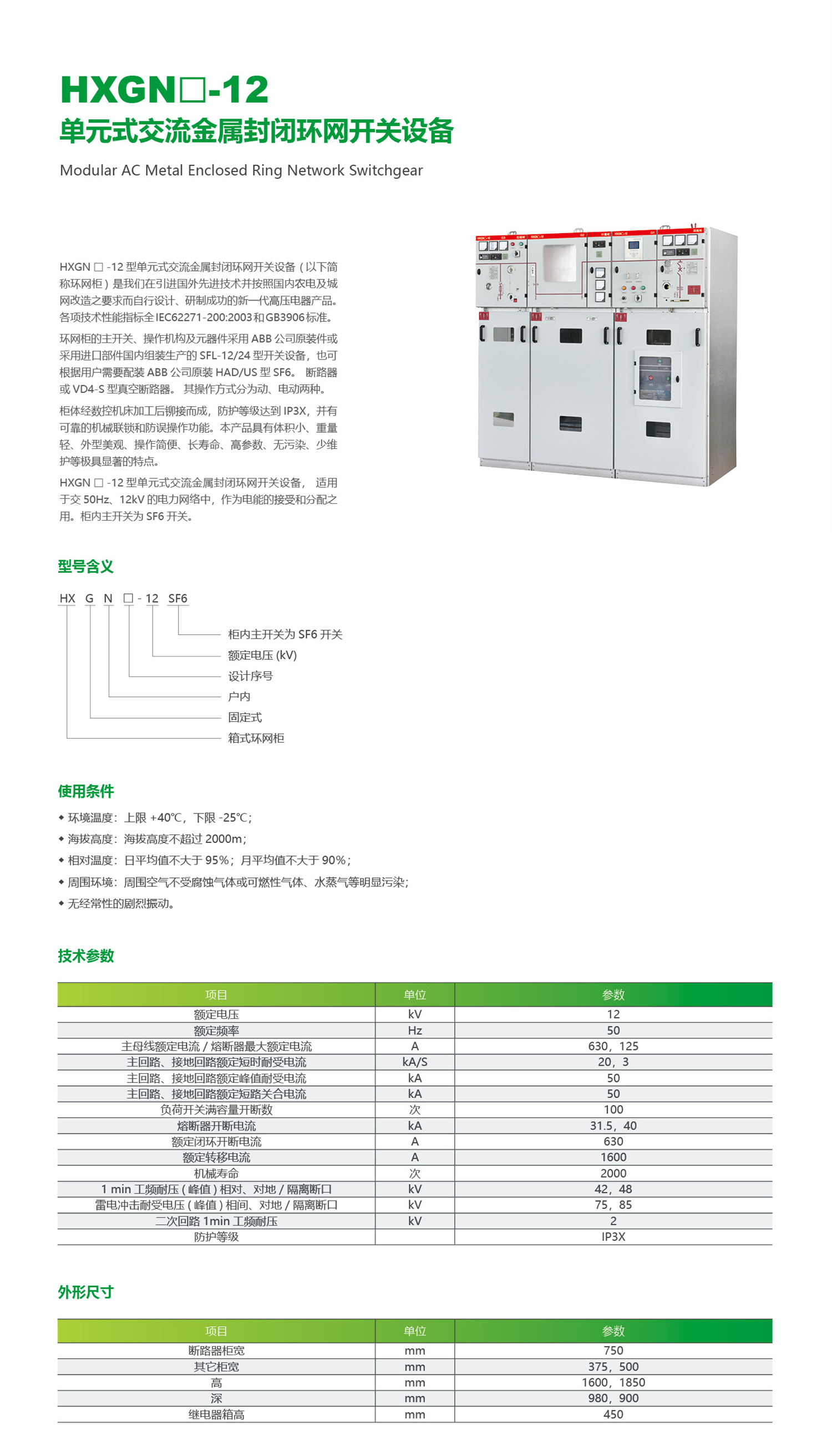 HXGN口-12型单元式交流金属封闭环网开关设备(以下简称环网柜)是我们在引进国外先进技术并按照国内农电及城网改造之要求而自行设计、研制成功的新一代高压电器产品。各项技术性能指标全1EC62271-200:2003和GB3906标准。